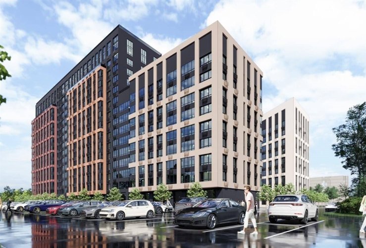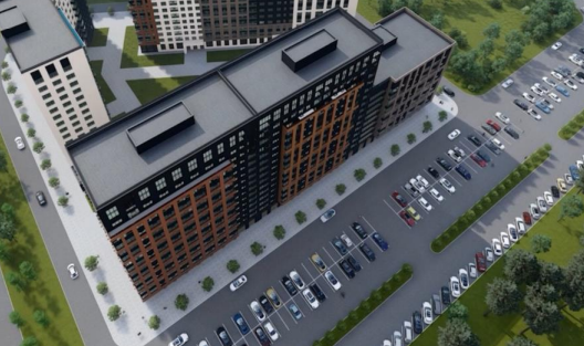 Со спуском из подъезда на лифте и достаточное количество парковочных мест по периметру ЖК