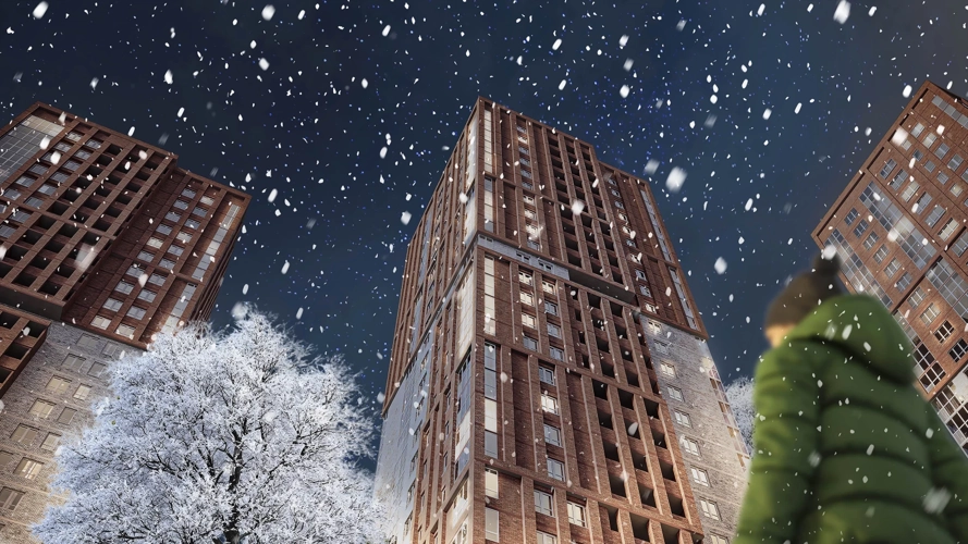 Фасады ЖК «Галилей» исполнены стильной «баварской» кладкой кирпича с чередующимися оттенками. Объёмная кладка подчёркивает вертикальный ритм домов.